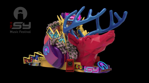 本次花车巡游所用的主花车形象是由鹿、花、电音等多项元素共同构成,以“鹿”为主形象,运用多重色彩,让其更显灵动非常。同时,在“鹿”的整体造型上,搭配具有音乐潮流代表性的耳机、音响、舞台等元素,使其不脱离ISY的音乐本质。而“鹿”身上众多炫彩花朵的创意来源便是延续了首届ISY的核心精神——“花与爱”。同是“爱”的主题,在主花车的整体形象塑造上加入更多的潮流色彩,这新奇的组合形式激发出人们在花海般的三亚享受音乐、享受舞台、享受爱的浪漫想象。