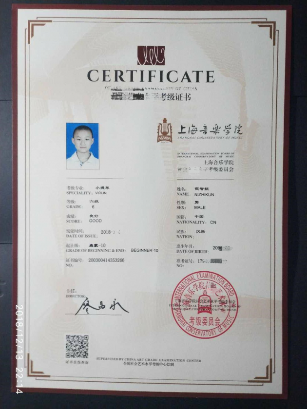 好在,VIP陪练很快推出了具有独家专利的摄像头,配合教学软件使用,能让陪练老师清楚看见琴童的指法。在VIP陪练的帮助下,倪智鲲继续着他有条不紊的考级路:每年考一级,并不激进跳级考,也不懈怠,在练琴这件事上把握住了自己的节奏,学琴7年,正好考出上海音乐学院小提琴7级,持之以恒最为可贵。