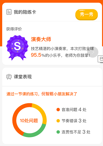 除了黄老师,倪智鲲妈妈也很感谢VIP陪练的班主任陆老师,对许多琴童家长来说,VIP陪练特别安排的班主任老师就像是现实中的班主任一样,临时有哪节课无法上需要调整,班主任都会帮忙在陪练老师和琴童之间协调。“随着课业压力越来越大,调课也是经常发生的事。VIP陪练的老师供不应求,每个老师的课程都按照时间点排得满满的,多亏班主任帮忙协调。我们也希望尽量有固定的学习时间,对孩子来说固定的上课时间能够更有仪式感。”