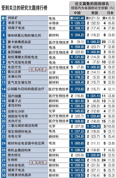 《受到关注的研究主题排行榜》(来自日经中文网)