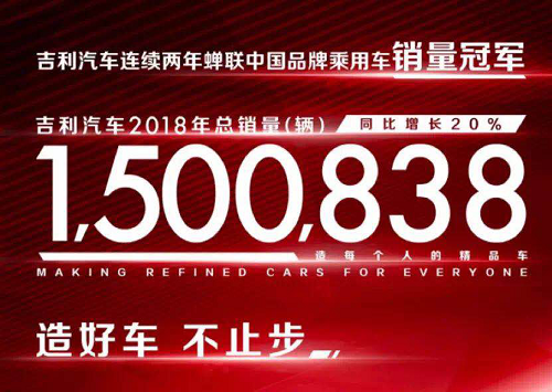 在汽车销量方面,2018年,吉利控股集团旗下各品牌累计汽车销量达215万辆,实现四年翻番。其中,吉利汽车销量、市场占有率均显著提升。仅2018年全年累计销量就达到了1,500,838辆,同比增长约20.3%,位居中国品牌乘用车销量第一。其市场占有率也由2017年的5%提升至2018年的6.3%,足见吉利家底之雄厚。