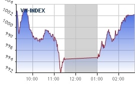 今天市场早盘和午盘的行情有所相反。早盘,抛售压力使越南指数下跌超过1%。然而,午后,抄底力量已出手,市场因此缩小跌幅,并成功保持1000点关。今天,HPG、HSG、MBB、VNM、 BVH等大盘股一律走强。和发集团 (HPG) 大涨1.3%至3.22万越盾/股,成交超过560万股;VNM、MBB、BVH等股票的涨幅分别为1.2%、1.3%和2.4%。