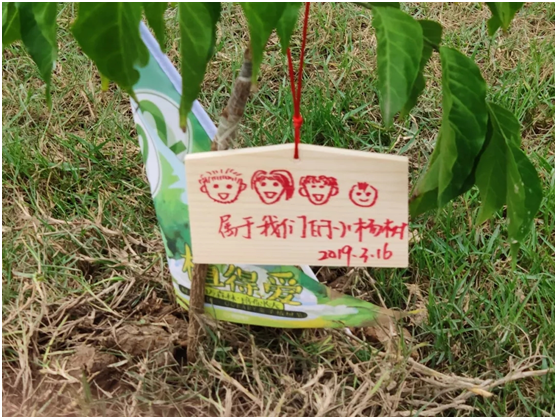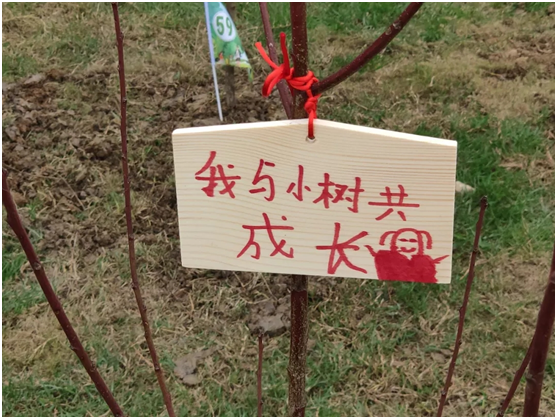 Q家安排给每组家庭一个植树礼包,包含手套和小木牌,孩子可以将对小树苗的寄语写在木牌上。挂在小树苗上的寄语很有孩子的风格,可爱的儿童画、搞怪的错别字,无一不充满着对小树成长的意义。