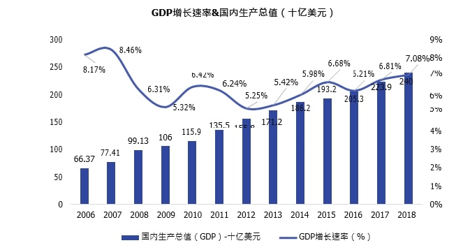 国内生产总值(GDP)增长率:2019 年第一季度的国内生产总值(GDP)与预计同比增长 6.79%,低于 2018 年第一季度 的增长率,但高于 2011-2017 年第一季度的增长率。