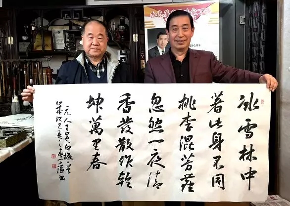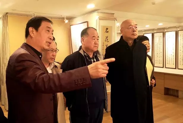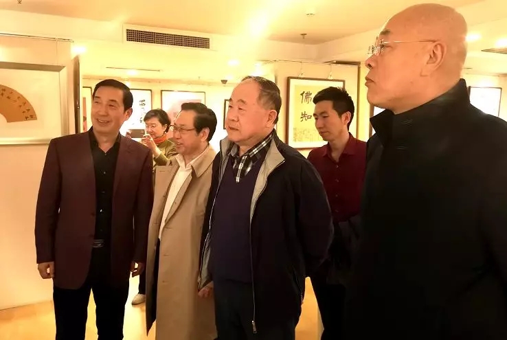 莫言先生一行兴致勃勃地观看了工作室悬挂的启功、沈鹏、中石、李铎,张海等大家的作品后,接着观看了丁谦先生的小型书法展览室。莫言先生对丁谦的书法作品给于了较高的评价,并品茶论道、谈古说今,还就文艺和书法创作谈了自己的看法。