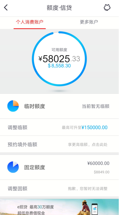 “全景智额”是招行信用卡运用金融科技,帮助用户进行“一站式”额度管理的功能。用户只需打开掌上生活App,进入“我的”界面,点击“额度·信贷”,就可看到全景智额视图,不仅能在此了解自己的可用额度、固定额度,还能手动调节临时额度,办理预约境外临额、账单分期、现金分期、掌上分期等一系列业务。