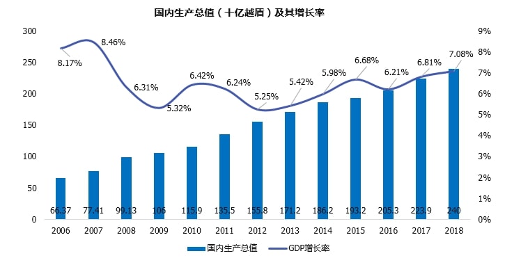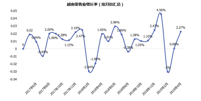 零售以及旅游总额:零售以及旅游总额:2019年4月商品零售业以及消费品服务业总额约为400万亿越盾,环比增长2.3%,同比增长12%。前4个月的商品零售业以及消费品服务业总额预计为1583.7万亿越盾,比去年同期增长11.9%。