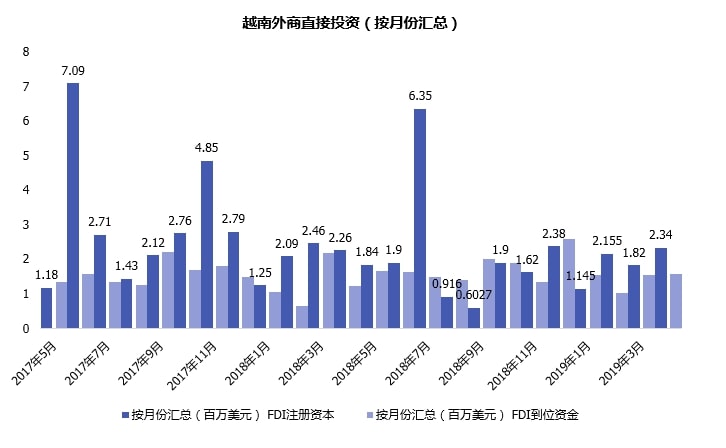 外国直接投资资金在投资项目数量和新批注册资金方面均创历史新高,截至2019年4月20日,新批项目总数为1082项,注册资本总额达53亿美元,创近4年来的最高纪录。
