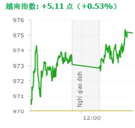 截至收盘,越南指数上涨5.11点,报975.14点,涨幅0.53%,成交1.385亿股,成交总额为3407.84万亿越盾。河内指数下跌0.35点,报105.04点,涨幅0.33%,成交2171万股,成交总额为2675亿越盾。