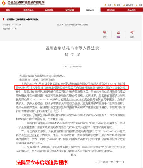 政府强推曾为地方经济发展做出贡献的民营企业破产,致使富邦钒钛的破产财产大量流失,本应挽救危困企业的重整程序异化为趁火打劫恶意刮分破产财产的“掠夺式重整”。政府为什么要针对一家民营企业?被偷偷划走的2亿多元资金又去了哪里?究竟又是谁有如此巨大的能量,能够影响政府、攀商行、攀中院等机构的决定?以上真相若不查清,在法治社会的当下,恐怕于法于理都难以让人信服。