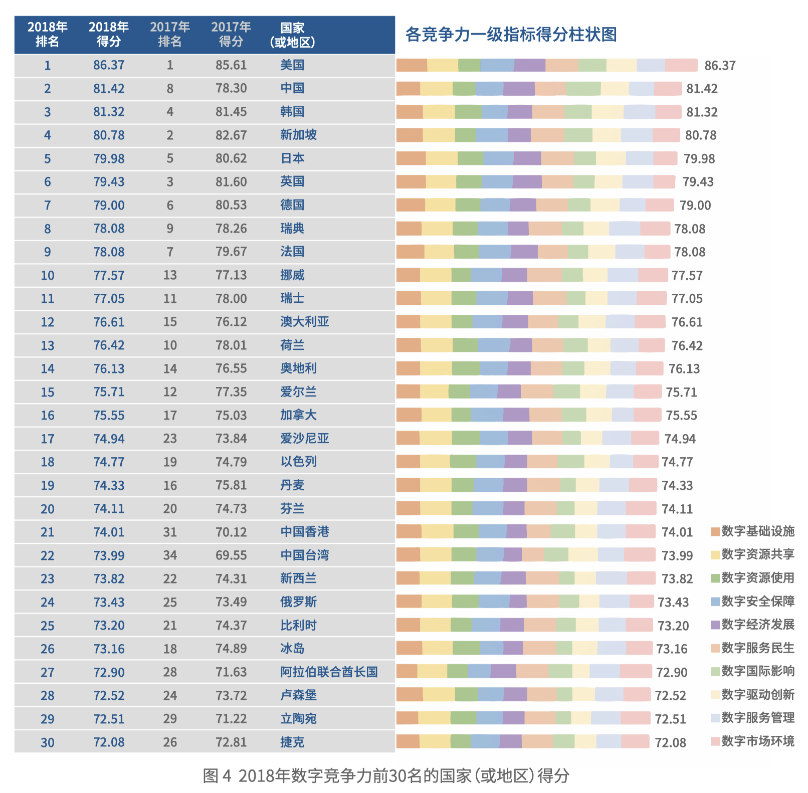 2018年,美国 以86.37分独占鳌头,并在各要素上呈现整体的领先态势。