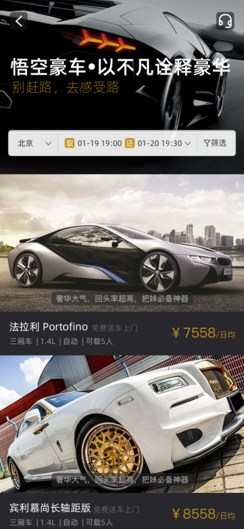 悟空租车在全国200多家店都上线了豪车业务,拥有各种豪车车型,奔驰迈巴赫S级、宾利飞驰、路虎揽胜、法拉利458、玛莎拉蒂总裁、阿斯顿马丁 DBS、兰博基尼Gallardo、劳斯莱斯古、斯特、悍马H3、迈凯伦650S,选一辆你喜欢的车子,拥抱梦想,更好地奋斗,体验追星逐月的感觉吧。