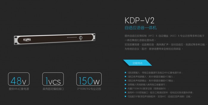 KDP-V2高清语音处理器具有2路话筒输入,每路话筒带独立音量调节及独立的48V幻象电源开关,2组立体声线路输入,2组立体声线路输出,其中一组互为固定编组功能,可外置AEC自适应回声消除扩展盒,具有2*150W/8Ω专业功放(简易版不带功放模块),可直接推动4只多媒体扩声音箱。