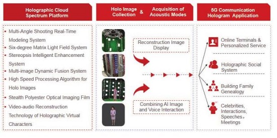 全息通讯需要通过多种技术糅合来实现,用户在拥有镜头和麦克风组成的特制相机前进行通话,镜头将用户转换成数字图像进行联网传输,而在接收方那一端,则是通过激光投影仪将画面投射在特制的光学设备上,从而实现3D画面的呈现。