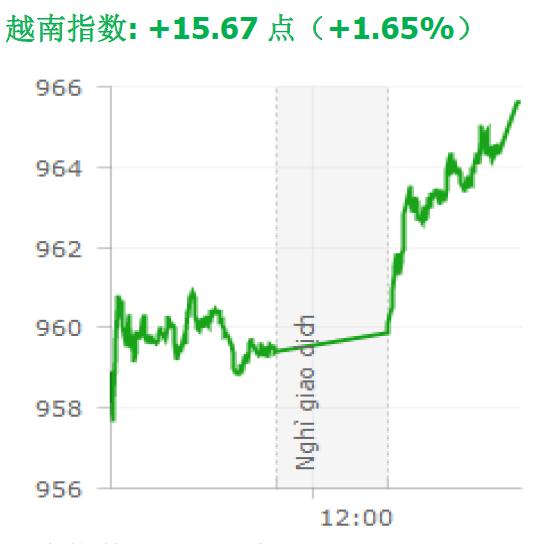 截至收盘,越南指数上涨15.67点,报965.61点,涨幅1.65%,成交1.6645亿股,交总额为3.8787万亿越盾;河内指数上涨0.58点,报104.09点,涨幅0.56%,成交2904万股,成交总额为3619.7亿越盾。