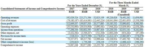 从招股书显示,微美全息云的净利润从2017年的7333千万元人民币增长至2018年的8921千万元人民币。总收入由2018年一季度人民币49226626元增长至2019年一季度78492282元人民币,增长了29265656元人民币,增幅为59.5%。净利润由截至2018年3月31日三个月止的22226934元人民币增长至截至2019年3月31日三个月止的37493792元人民币,增长了15266858元人民币,增幅为68.7%。微美全息云的总收入从2017年的192,029,524元人民币增长至2018年的225,271,564元人民币。