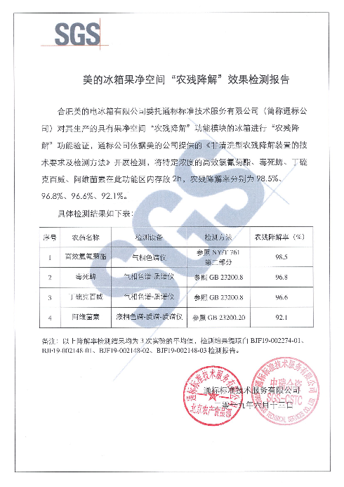 (权威认证机构SGS公司颁发证书认可美的冰箱果净空间“农残降解”效果)