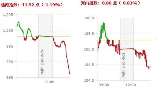 截至收盘,越南指数下跌11.92点,报986.02点,涨幅1.19%,成交1.5432亿股,成交总额为3.66381万亿越盾。河内指数下跌0.86点,报104.43点,跌幅0.86%,成交3350万股,成交总额为4298.4亿越盾。