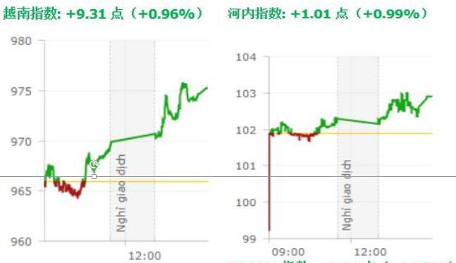 开盘后不久,越南股市交易较为活跃,两市指数均逆转上升。截至收盘,越南指数上涨9.31点,报975.24点,涨幅0.96%,成交2.1924亿股,成交总额为6.0682万亿越盾。河内指数上涨1.01点,报102.9点,涨幅0.99%,成交2569万股,成交总额为3552.9亿越盾。