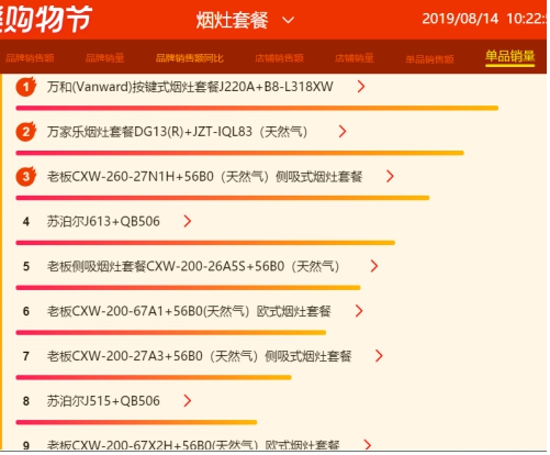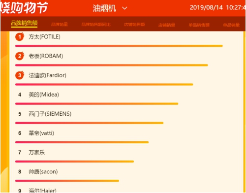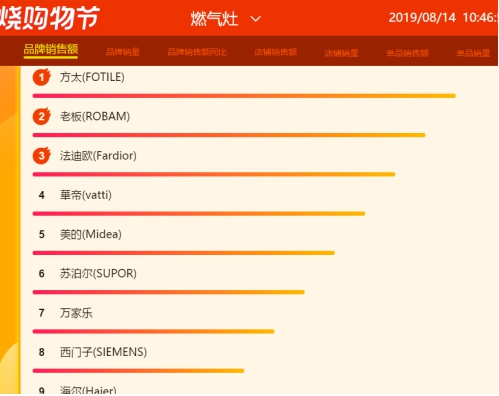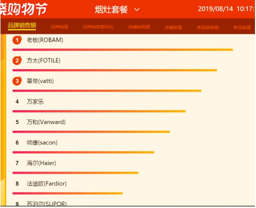 从8月14日烟灶套餐累计数据显示,就品牌销售额方面老板、方太、华帝占据榜首前三,万家乐、万和、帅康排位居中,占据四到六名,而海尔、法迪欧、苏泊尔等老炮排位暂时靠后。