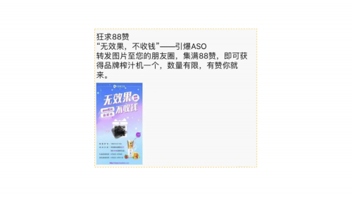 所示为某推广公司做的集赞裂变活动用户朋友圈截图,该活动设置了两个阶梯奖励,集满38赞即可获得“ASO优化宝典一份”、集满88赞即可获得品牌榨汁机,优质干货包加上实物奖品的诱惑给了用户参加活动十足的动力。