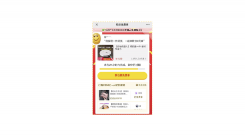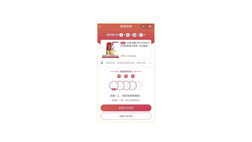 如下图所示,为某电商平台拼团页面截图,该拼团裂变模式是有一个发起人(团长)下单,还需邀请4人参团才能拼单成功,拼团(组队)裂变的基本逻辑是,发起者对商品发起团购,再根据互惠心理邀请一定数量的团员参团,形成拼团裂变。也可以设置为老团长只能邀请新人才有资格参与,完成拉新裂变。拼团裂变类似,在淘宝双11、百度APP新年红包组队集卡就是组队、集卡裂变形式,只是增加了购买门槛。