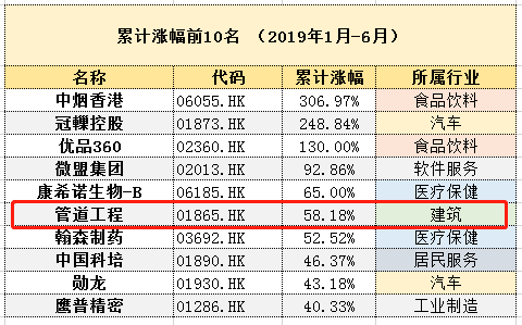 于2019年上半年(1月至6月)港股新股累计涨幅相关数据显示,管道工程截止2019年6月30日前累计涨幅58.18%,在上半年总共香港上市的74只新股中,仅次于排名第五的康希诺生物,位居第六,也是重型基建行业中,新股累计涨幅第一名。