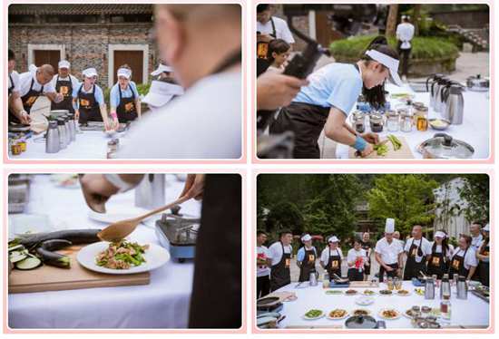 午休过后,各队派代表去菜园采摘新鲜蔬菜,为团队提供烹饪食材。大家带上天一美膳定制围裙,切菜炒菜有模有样。没过多久,食材就变成了盘中的美味。经过了三天的学习和体验,大家都学会了如何做减脂餐。