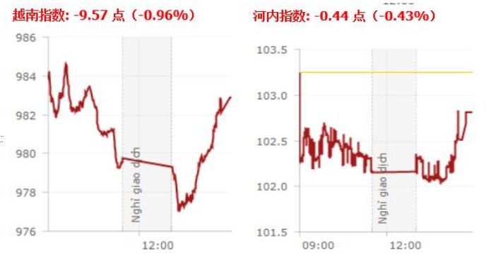 截至收盘,越南指数下跌9.57点,报982.88点,跌幅0.96%,成交1.8979亿股,成交总额为4.3361万亿越盾。河内指数下跌0.44点,报102.81点,跌幅0.43%,成交2633万股,成交总额为4420.1亿越盾。