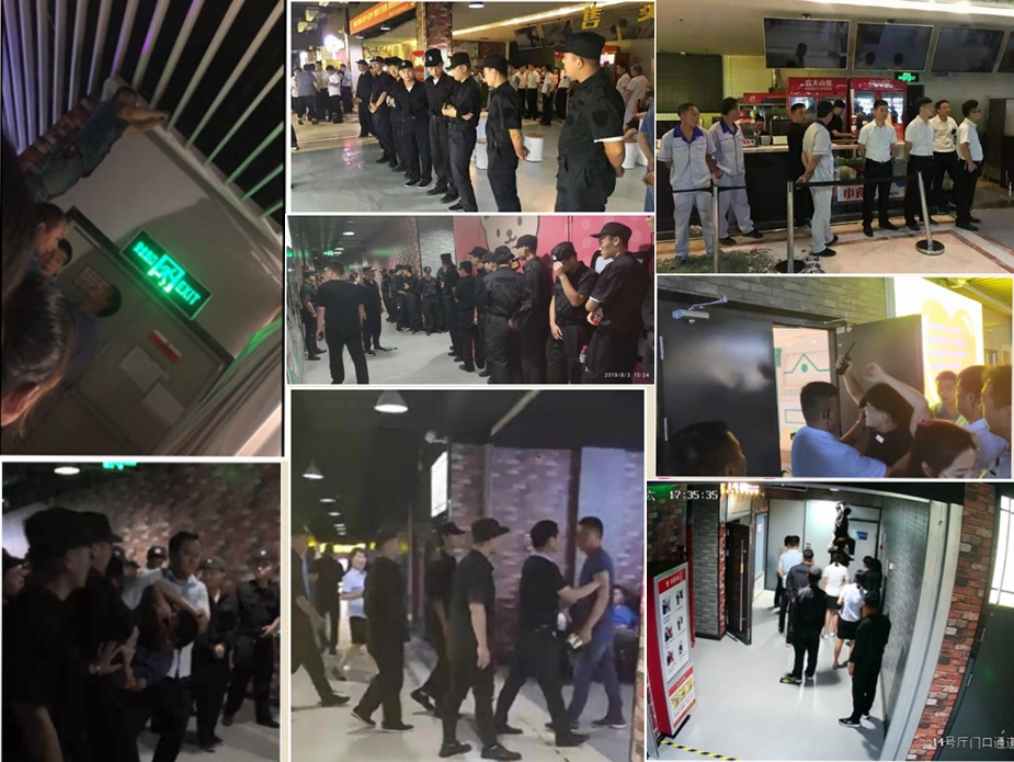 然而,事态发展并非如此,8月3日15时左右,以F管理公司王某某带头的数十名身穿黑色衣服的人员进入富田影城,与此间隔不久,F管理公司高某、胡某、汪某某、刘某某、孙某某、白某等人随着身穿蓝色、白色、迷彩等衣服的人员从不同渠道涌入富田影城,其中有人手持录像设备,及类似铁棍的工具。监控录像显示,他们似乎分工明确,一部分人控制售票处,一部分人清理影城工作人员和约一千观影人员,一部分人断电、拆店牌,还有人手拿胶水填充影城内各个门的锁眼。
