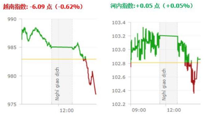 今日越南股市早盘时呈现良好复苏态势,但空头势力尾盘增大,致使两市指数的涨幅有所缩小,越南指数甚至下跌超过6点。截至收盘,越南指数下跌7.42点,报976.79点,跌幅0.62%,成交1.99亿股,成交总额为4.66万亿越盾。河内指数微涨0.05点,报102.86点,涨幅0.05%,成交2348万股,成交总额为3579.4亿越盾。