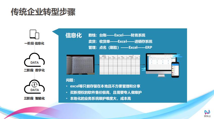随后,他还对京东(仙游)数字经济产业园园区的企业进行分析,分析结果显示目前园区企业信息化程度普遍较低。基于这个现状,李炜分享了传统企业如何转型(传统企业转型的三个步骤:信息化 数字化 智能化,见下图)。