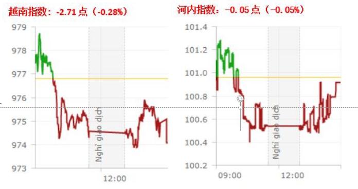 截至收盘,越南指数下跌9.98点,报974.08点,跌幅1.01%,成交6.6457亿股,成交总额为15.2259万亿越盾。河内指数下跌1.4点,报100.92点,跌幅1.37%,成交1.0109亿股,成交总额为1.3372万亿越盾。