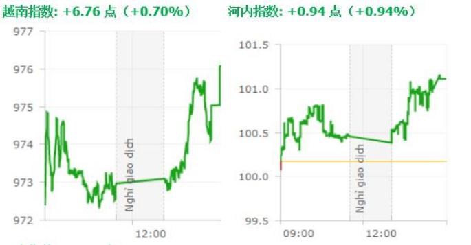 越南证券市场今日较为活跃,两个指数同步上涨,尤其是越南指数上涨6点以上。交易量仍保持低水平,但与上几个交易日相比今日交易量已有所增加,显示出资金流逐步回归市场。