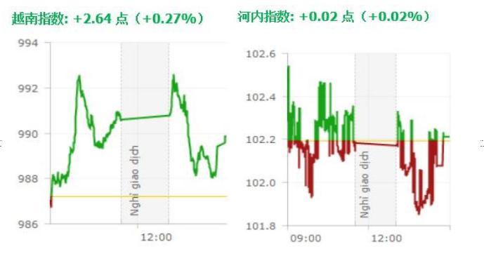 截至收盘,越南指数上涨2.64点,报989.86点,涨幅0.27%,成交1.871亿股,成交总额为4.485万亿越盾。河内指数上涨0.02点,报102.11点,涨幅0.05%,成交3850万股,成交总额为4608.7亿越盾。