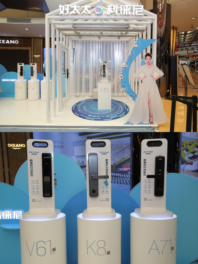好太太的潮酷智能体验店,蓝白简约配色,极具未来感,智能晾衣机、智能锁、智能交互通通可进行体验,专人进行讲解,科技感满满。