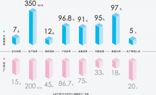 受以上因素影响,数字化智能工厂成为了传统制造业必然的趋势。据云栖智造粗略计算,如果应用云栖智造SaaS产品,以年产值3000万的离散型工厂为例,智能工厂能够为制造企业提高75%的生产效率、缩短53%的交货周期、提高10%的良品率、减少73%的物料滞留、提高16%的设备利用率,通过上面几项能够为工厂带来约200万元的利润!这是数字化工厂所带来的效果。