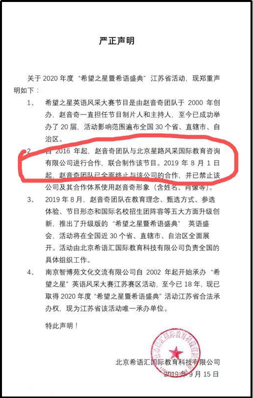 近来闹得沸沸扬扬的“希望之星英语风采大会”真假李逵事件。当事双方均发表了相关声明。其中,星路风采于9月18日的声明中,强调与赵音奇终止合作关系,并说明了“希望之星英语风采大会”与赵音奇创办的“希语盛典”无关。而赵音奇先生创办的希语汇则前后有两份声明,一份是于9月16日声明,“赵音奇团队已于8月1日全面终止与北京星路风采国际教育咨询有限公司的合作”。紧接着赵音奇先生在9月18日19:18的回应星路风采的声明中又称“星路风采在他不知情的情况下发出《“希望之星”英语风采大会与赵音奇终止业务合作声明》”,两份声明内容自相矛盾,谁在说谎不言自明。