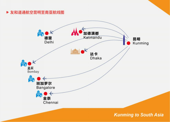 友和道通航空自2011年开航以来,一直致力于深挖南亚、东南亚等“一带一路”沿线区域的市场潜力。截至目前,友和道通航空已开通昆明至印度(德里、孟买、金奈、班加罗尔)、孟加拉(达卡)、越南(河内)、尼泊尔(加德满都)、阿联酋(迪拜)等数条国际货运航线,每周往返达60余班,航线数量和航班班次均位于行业前列,在“一带一路”沿线市场尤其是南亚、东南亚地区建立了极具影响力品牌。2018年,友和道通航空凭借在国际货运方面的努力,被云南机场集团评为“2018国际航空货运突出贡献奖”。未来,在航空市场发展新格局下,友和道通航空将深挖市场新机遇,为实现区域内更为高效的互联互通贡献力量。