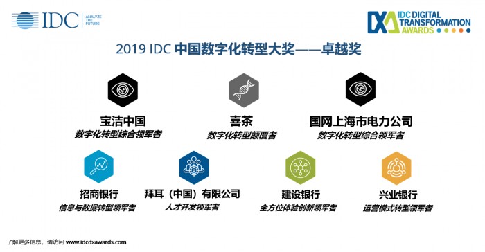 2019 IDC中国数字化转型大奖共有55个项目、16位人物荣获优秀奖。其中又有来自7个组织的优秀项目从六大奖项类别中脱颖而出荣膺卓越奖。这几家组织有:拜耳(中国)有限公司、招商银行、建设银行、国网上海市电力公司、宝洁中国、喜茶和兴业银行。
