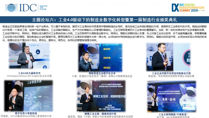 IDC中国副总裁兼首席分析师武连峰先生在大会中表示:数字化转型不能保证成功,但不做数字化转型注定会失败。今天,数字化转型领先者和落后者的差距正在拉大,根据IDC对全球企业的研究,数字化的企业可以保持销售额年均10%以上的增长,利润年均12%以上的增长,而非数字化的企业则是持平或下降。数字化转型已经不是选择,而是必然。深刻理解数字化转型最新趋势,制定赢得未来企业新竞赛的策略至关重要。武先生首先分享在贸易战大背景下中国经济的面临的挑战与商机,接着梳理了数字化转型的最新趋势,包括数字技术在重新定义产业与行业、数字化产品与服务渐成主流、供应链与中介重构推动效率倍增、生态重构促进企业创造新价值、人才争夺与未来工作愈演愈烈。最后给出了赢得未来企业新竞赛的4大策略是:洞悉客户新需求、创造企业新能力、建设IT新架构、打造行业新生态。