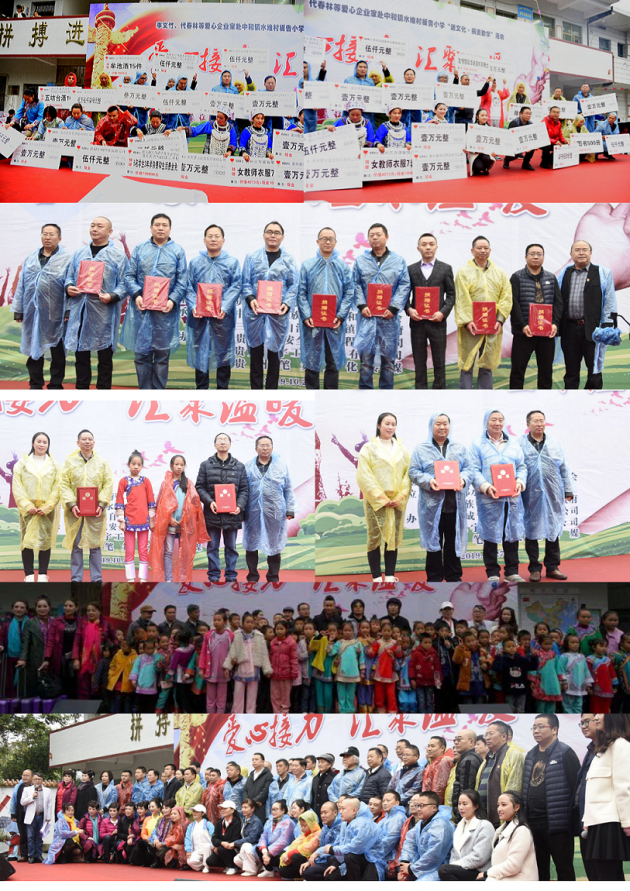 贵州牟池酒业有限公司牟道勇董事长15件酒(价值10800元);贵州梦达建筑有限责任公司总经理付秋裔10000元;贵州黔源华通项目咨询管理有限公司总经理陈娜10000元;贵州三方源有限公司总经理倪忠林1000元,另捐7套女教师衣服(价值4073元);广东好倍亮科技有限公司驻贵阳营运中心总经理周述林6000元;贵阳恒昌暖通设备有限公司总经理肖首明6000元;贵州省地震局干部职工5160元;遵义恒美印务有限公司总经理雷近免费制作活动背景墙、捐赠牌、手提袋(价值5100元);江苏盛华系统集成贵州分公司副总经理严文臣5000元;上海成峰流体设备有限公司贵州分公司总经理董万强5000元;贵州友和混凝土有限公司贵阳素荣混凝土(泵车服务)有限公司董事长牟光文5000元;贵州云上中消防技术服务有限公司总经理张明伦5000元;贵州鸿铭涵物资有限责任公司总经理黄文进5000元;贵阳宇鸿科技有限公司总经理王鸣5000元;贵州诚建建材科技有限公司总经理涂建江5000元;遵义欣鸿源房地产开发有限公司董事长王德强5000元;贵州建鑫诚达电线电缆有限公司总经理吕昌信5000元。