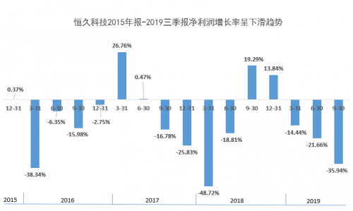 事实上,恒久科技自2016年上市以来,主业的业绩持续疲弱,呈现增收不增利的状况,今年前9个月的扣非净利润更是大幅下滑。具体数据来看,恒久科技2016年、2017年、2018年和2019年1-9月营业收入分别为2.75亿、2.86亿、3.19亿、2.11亿,同比增长率分别为21.11%、4.25%、11.33%、-6.12%;归属上市公司股东净利润分别为4105万、3045万、3466万、1508万,同比增长率分别为-2.27%、-25.28%、13.84%、-35.94%。