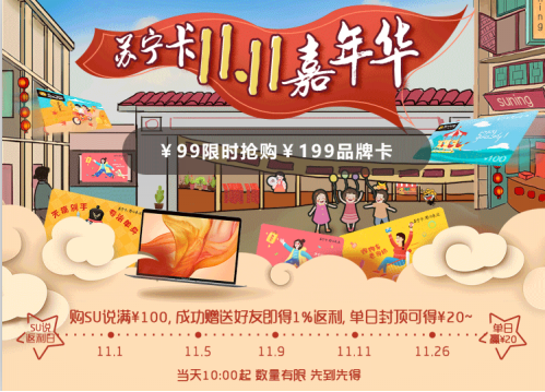 目前,苏宁卡双十一活动正在火热进行中,优惠名额有限,赶快参与体验吧!