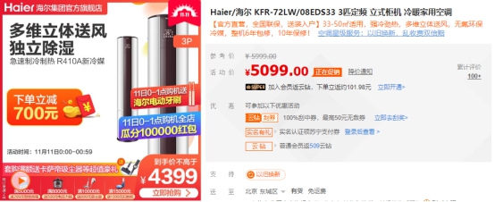 在家电方面,今年双十一期间,苏宁联合美的、格力、海尔等大牌开启空调五折抢。活动期间,美的1.5匹3级变频挂机到手价1999元,格力1.5匹变频空调挂机俊越系列2399元,海尔3匹定频柜机到手价4399元,再刷行业底价。彩电力推坐标价,其中PPTV 43吋 799元、长虹55吋1299元、小米 65吋1999元、海尔70吋2899元。