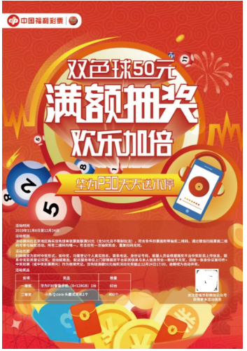 2019年11月8日至12月24日期间,彩民在北京地区购买双色球单张票面额满50元(含50元且不限制玩法),符合条件的票面附带摇奖二维码,彩民通过微信扫描票面二维码可参与抽奖活动。所有二维码均唯一,有且仅有一次抽奖机会,重复扫码无效。活动奖品