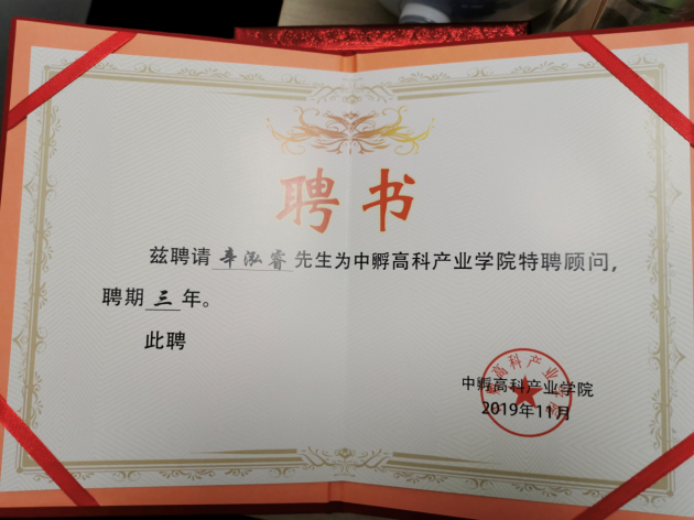 2019年11月,中孵高科产业学院启动了首批特聘顾问的聘请计划,旨在聘请有较高行业专业水平、丰富的实践经验并具备创新开拓精神的企业创始人、投资机构负责人、上市公司高管等组成企业咨询服务团队,在产业学院领导下开展工作。北京渤海泓媒科技有限责任公司(佰链荟)创始人辛泓睿,被聘请为中孵高科产业学院首批特聘顾问。