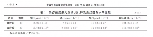 治疗4周后,总有效率为95.0%(38/40),其中痊愈率22.5%(9/40),显效率35.0%(14/40),有效率为37.5%(15/40),无效率5.0%(2/40).治疗前后患儿血铜、铁、锌及血红蛋白水平比较见表1。