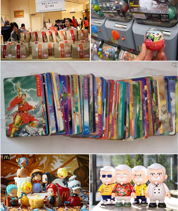 吴文东认为,通过进一步去探究盲盒的起源与历史,可以发现盲盒经济事实上在发达国家已有众多应用。“盲盒”营销起源于明治末期日本的“福袋”,当时日本百货公司在新年期间本意是为了处理尾货、清理库存而制作和销售福袋,福袋中内容不会事先公开,但因为初衷是处理变现,往往会放入高于福袋标价的商品。尽管起初福袋的价格通常并不高,甚至低于商品平均价格,但百货公司福袋的生意却好起来,久而久之就成为了新年期间的常规促销手段;类“盲盒”经济,在日本后续又发展出“扭蛋机”模式,玩家投入100日元获得内有玩具的扭蛋,而具体是什么玩具则需要打开扭蛋才知道,经常有言情剧中有这样的桥段:男主为了女主喜欢的某款扭蛋,把扭蛋机清空了;而对于中国80后、90后来说来说,最类似的就是小时候火爆过的吃干脆面集水浒卡,干脆面是次要的,水浒卡才是核心吸引物;其实在美国快速餐饮界也运用过类似机制去促销,比如麦当劳与肯德基两个大佬,总会在特定节日推出特定公仔组合配在套餐之中,也具有收藏与随机性。