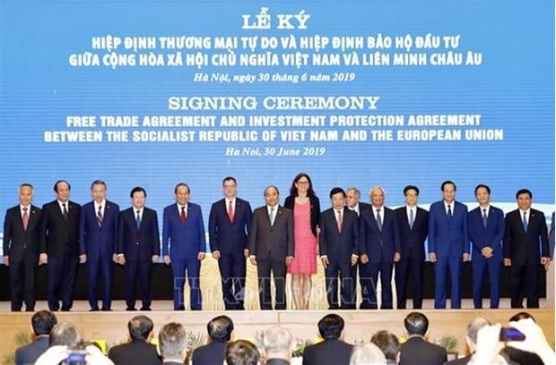 越南与欧盟于2019年6月30日在河内签署自由贸易协定(EVFTA)和保护投资协定(EVIPA)。这是越南与欧盟最具规模、最高标准的两项新一代贸易和投资协定。根据该协定,双方将消除货物贸易近100%的关税,是越南所签署自由贸易协定中自由化水平最高的一项协定。此外,EVIPA协定也具有重要意义,为全球投资者提供更加开放和便利的经营投资环境。